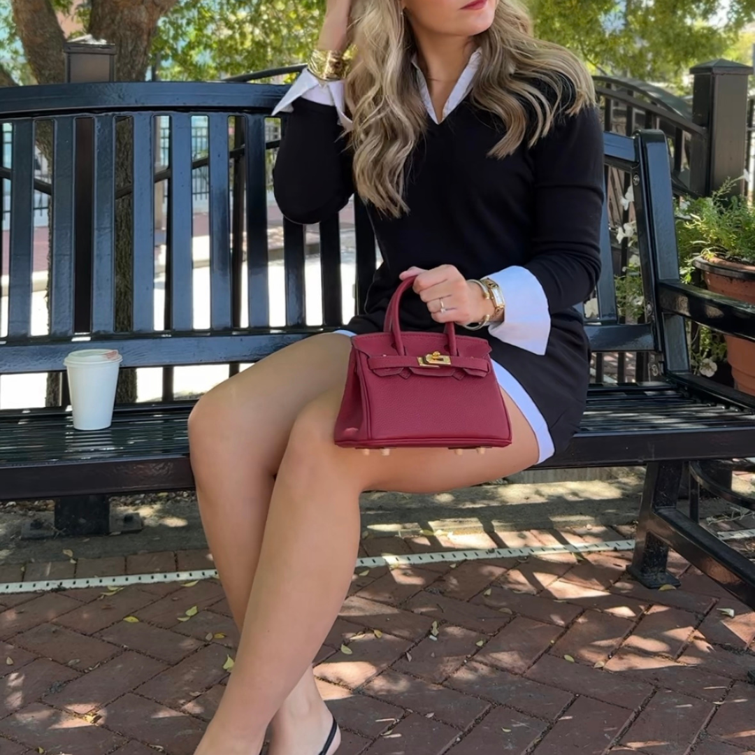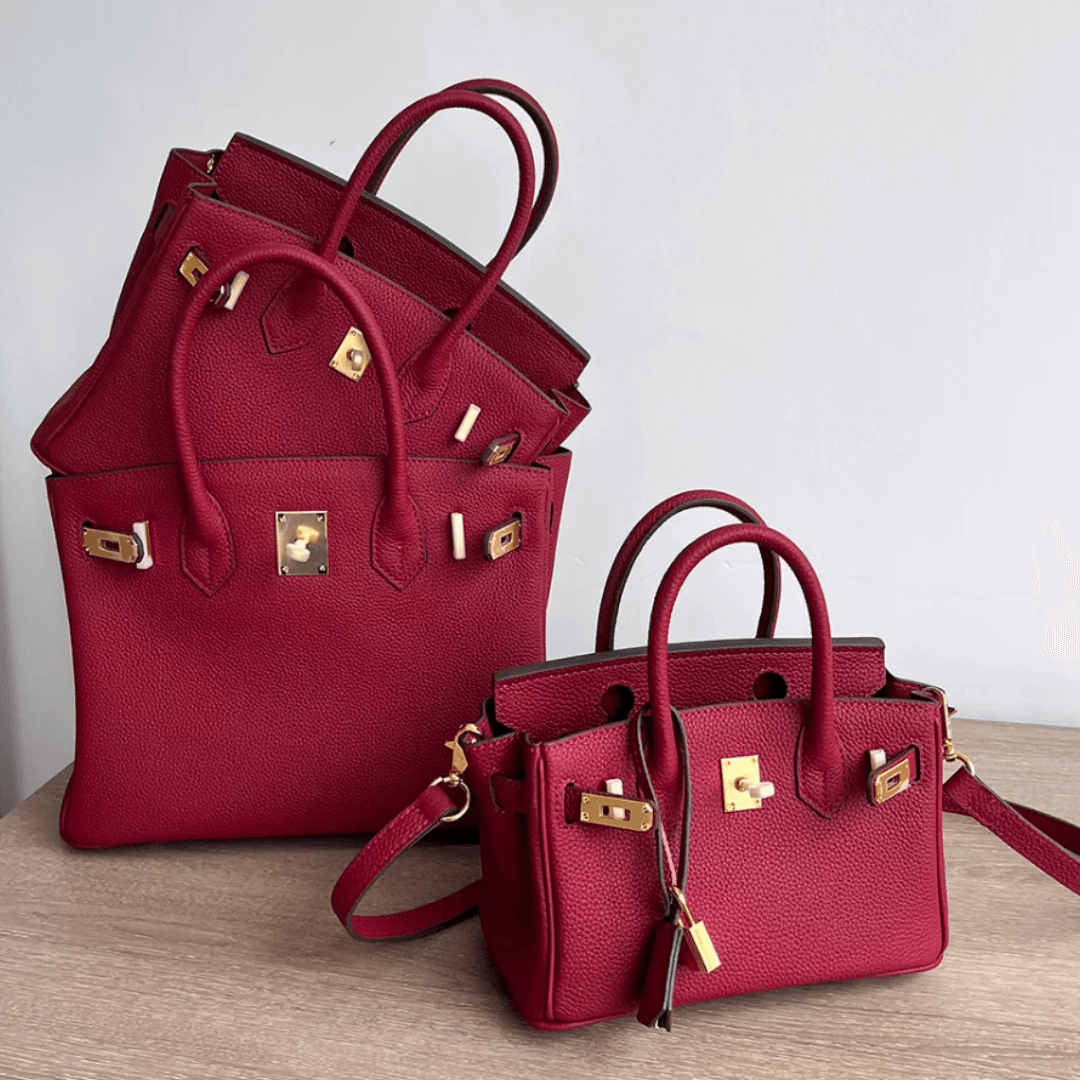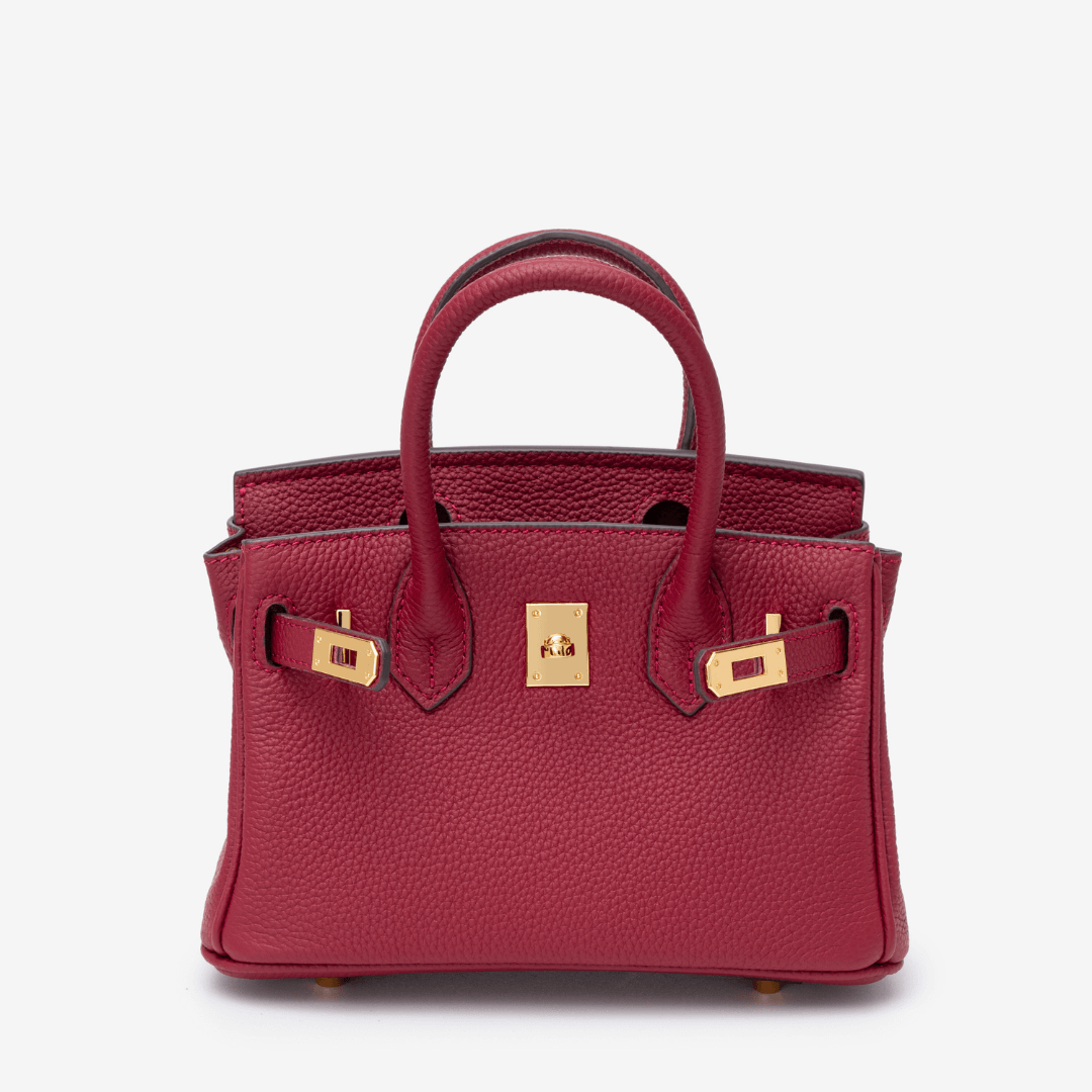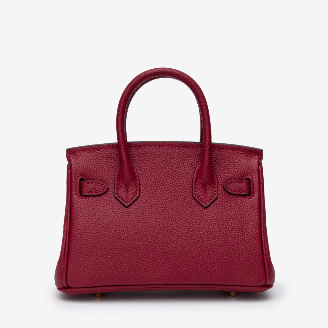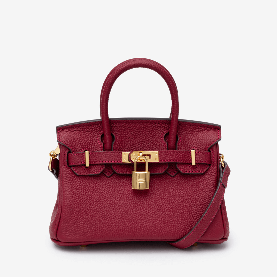 Crafted from rich burgundy pebbled leather and finished with gold hardware, the Camelia bag exudes quiet power. With a detachable strap and structured shape, it’s a refined companion for workdays, date nights, and everything in between.