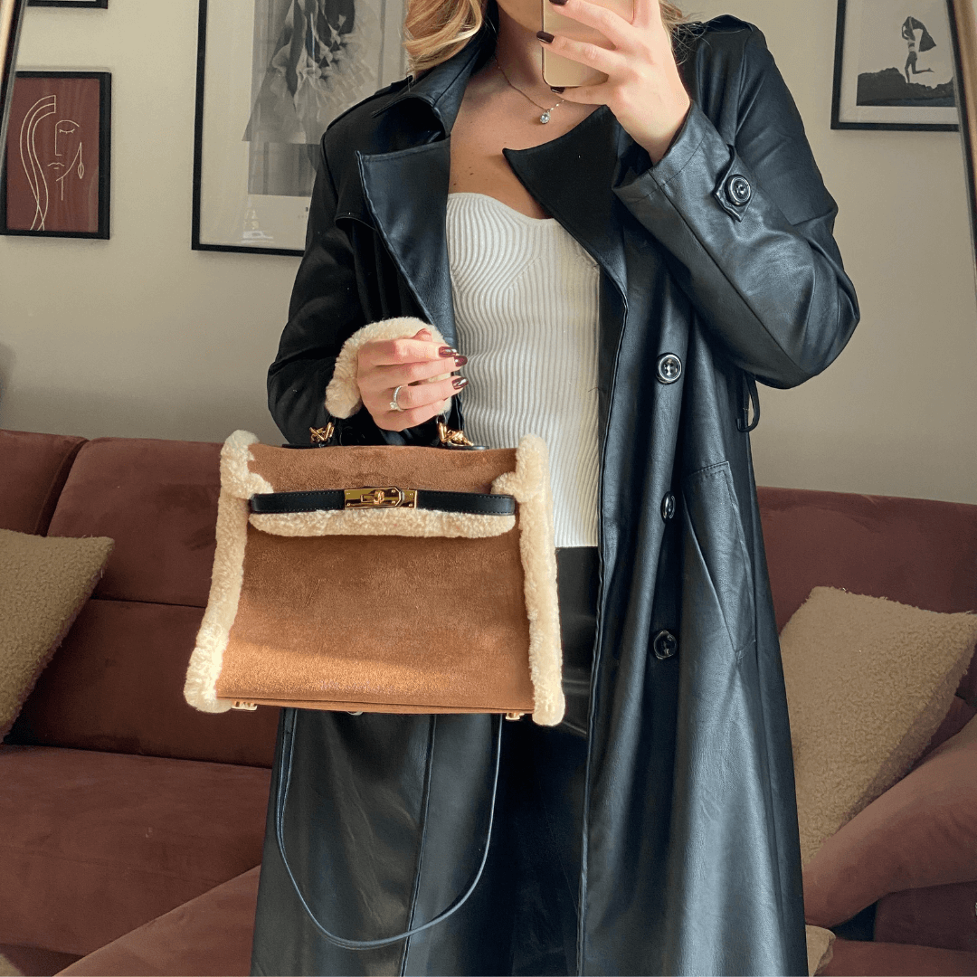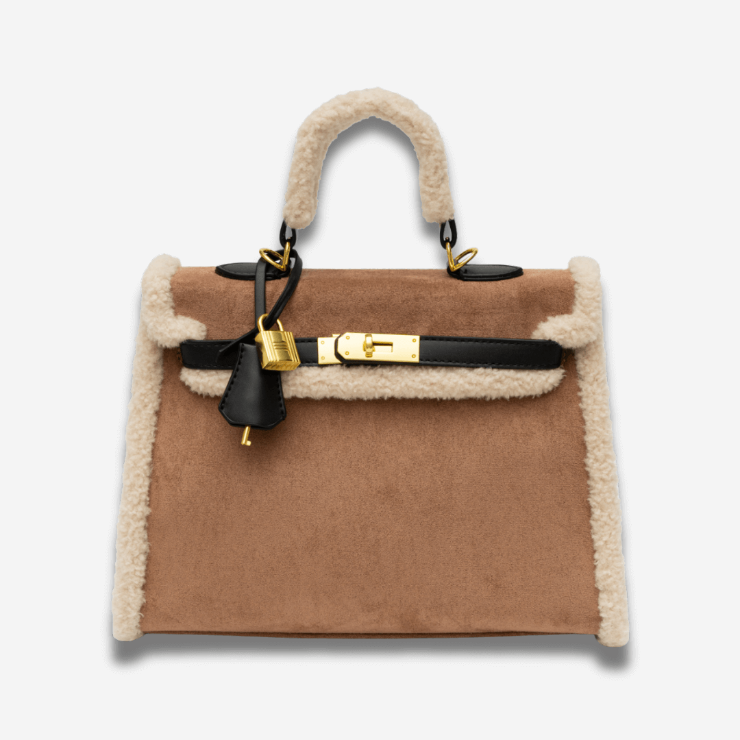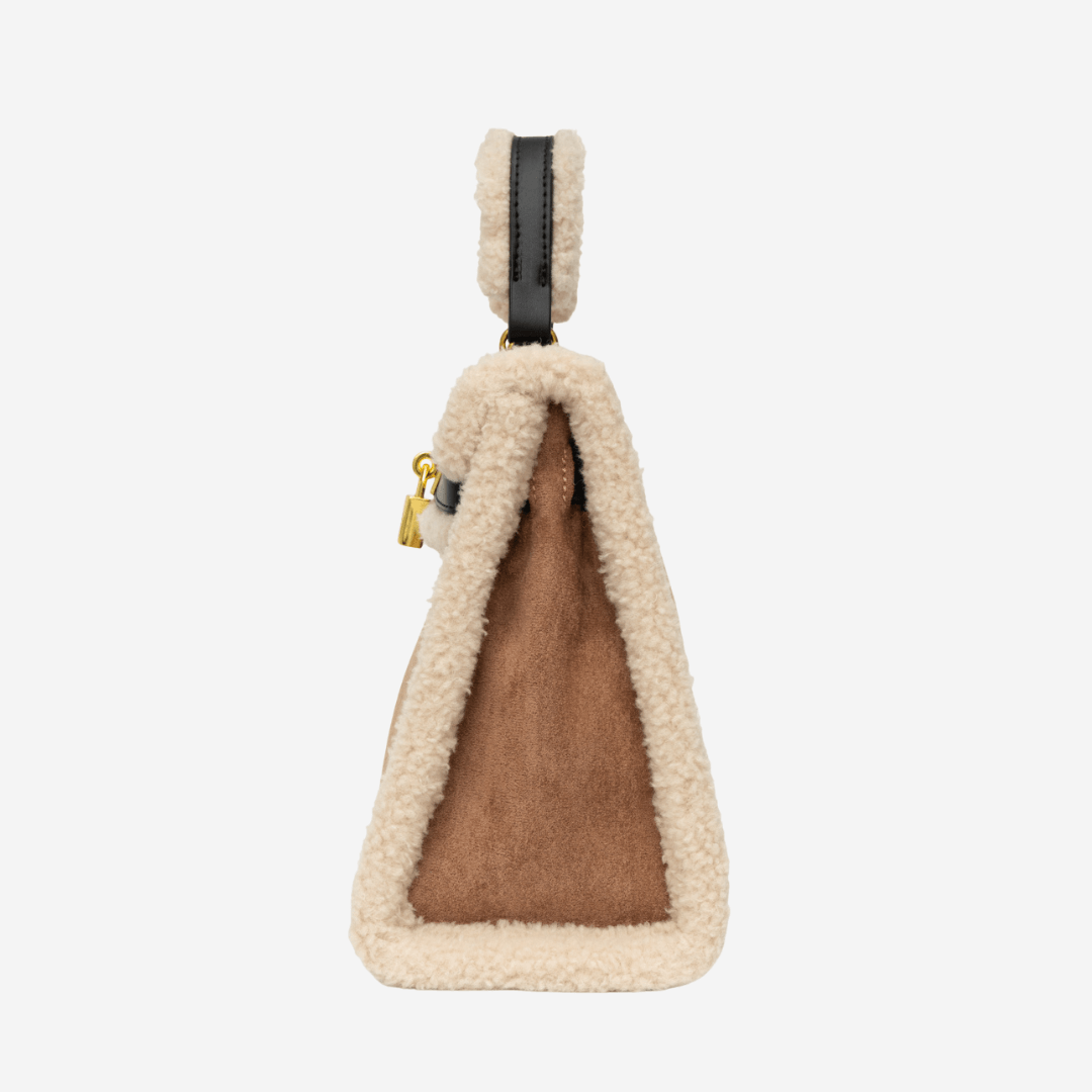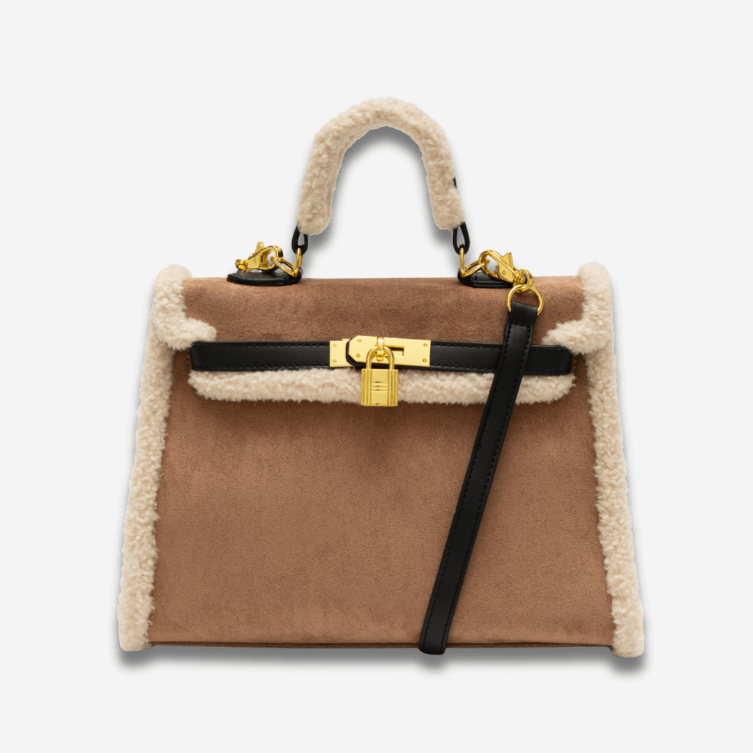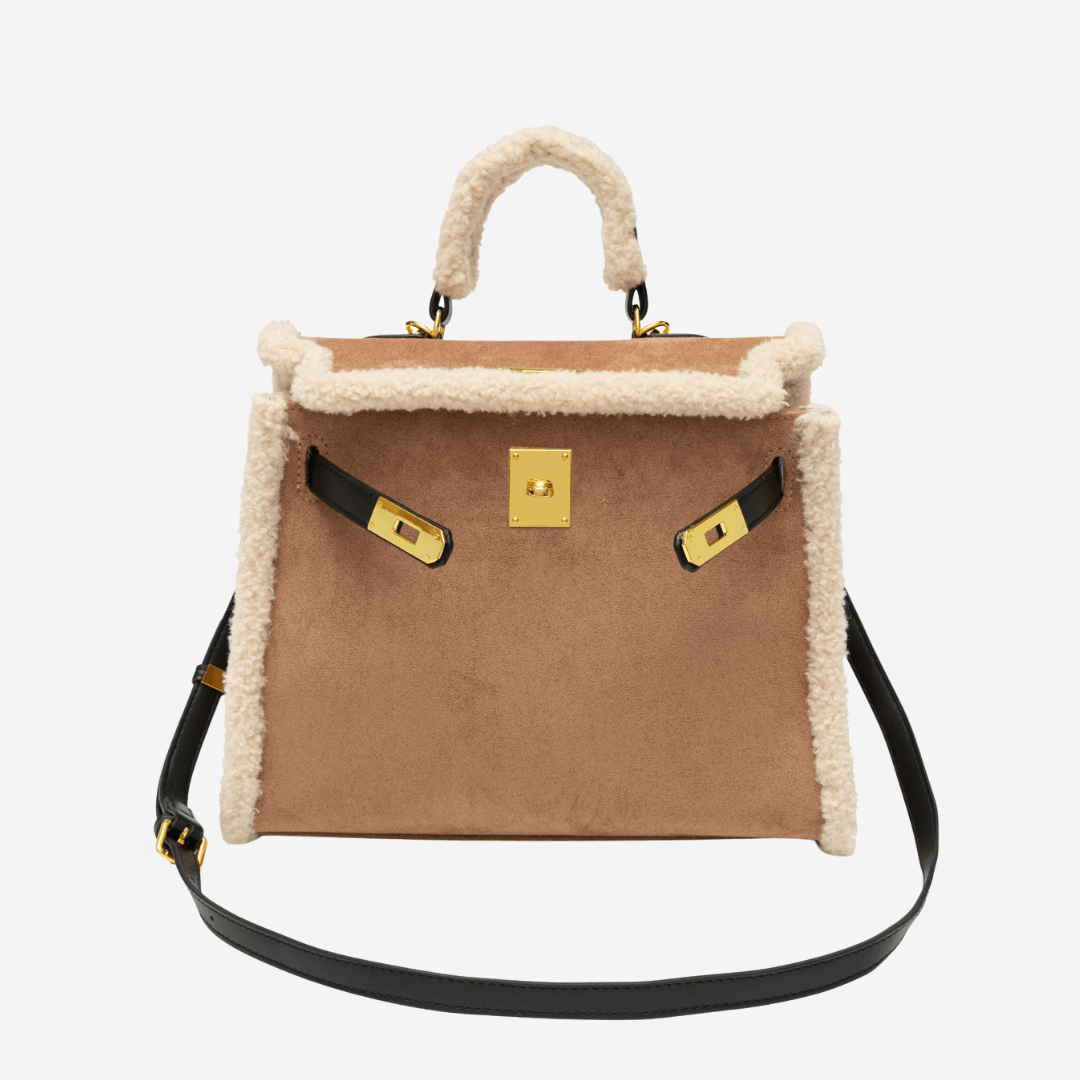 A luxurious suede handbag with stand-out shearling trim, a chic leather strap, and eye-catching gold padlock detail. Welcome the winter season in high style as the Eleonore handbag carries your every travel story with ease.