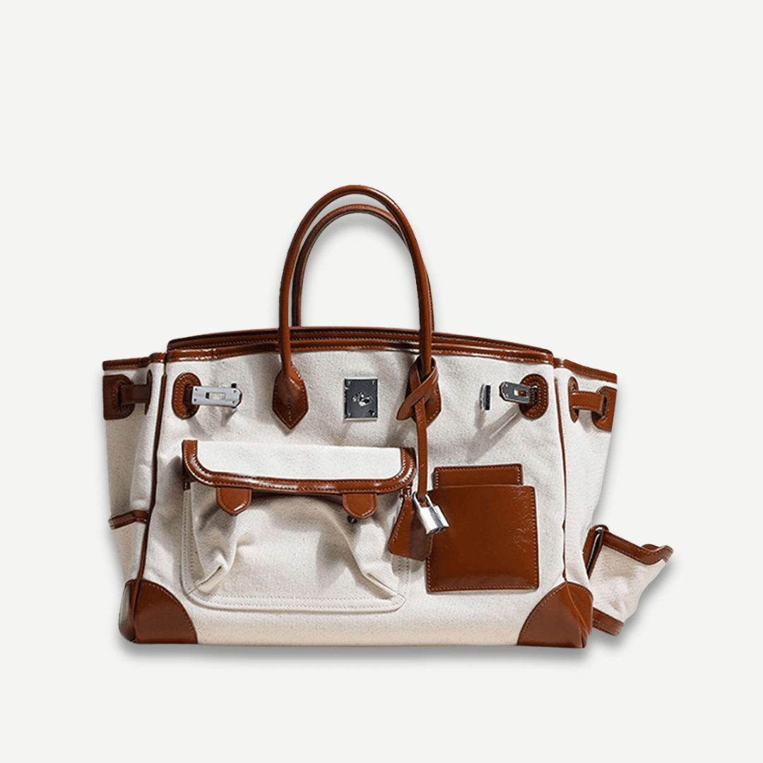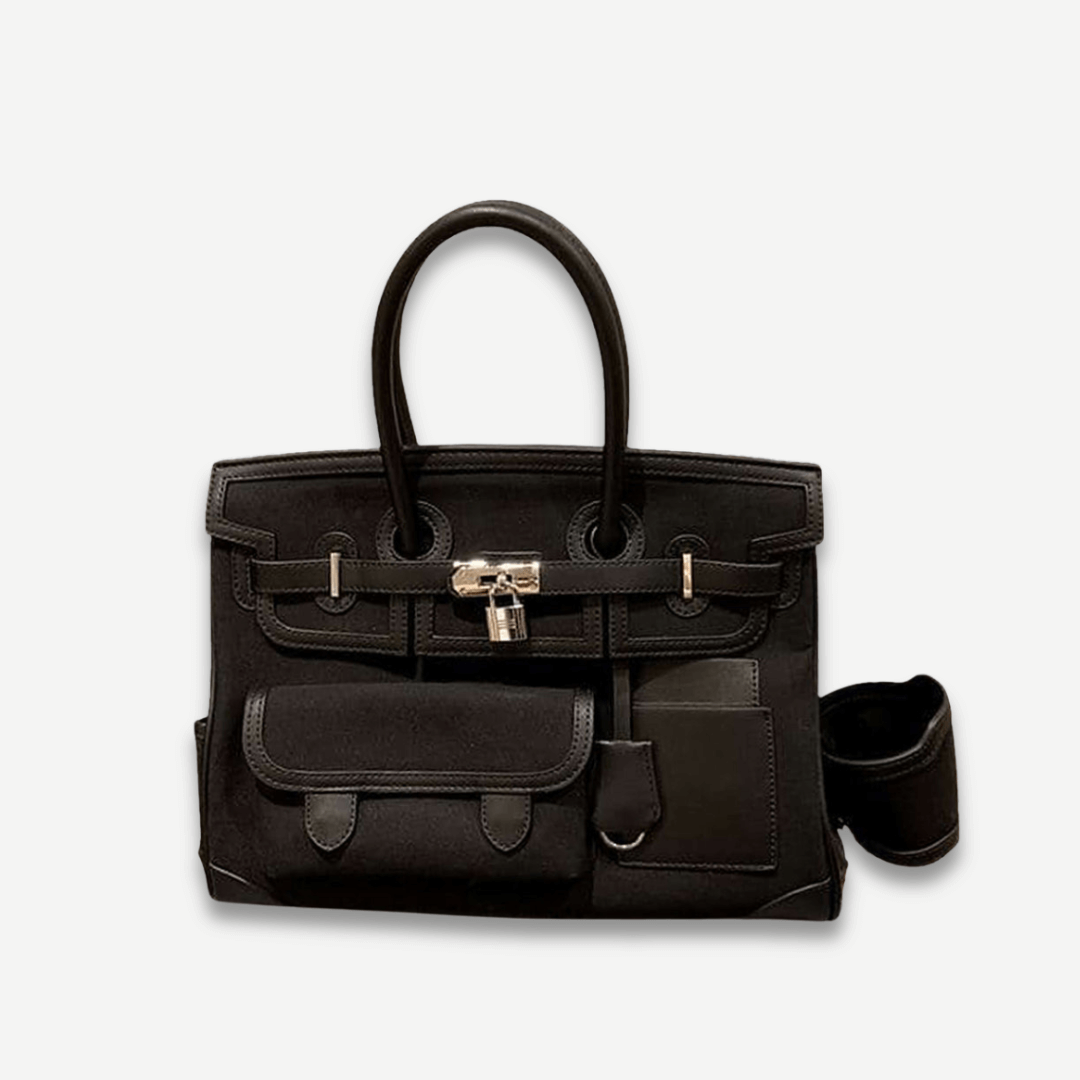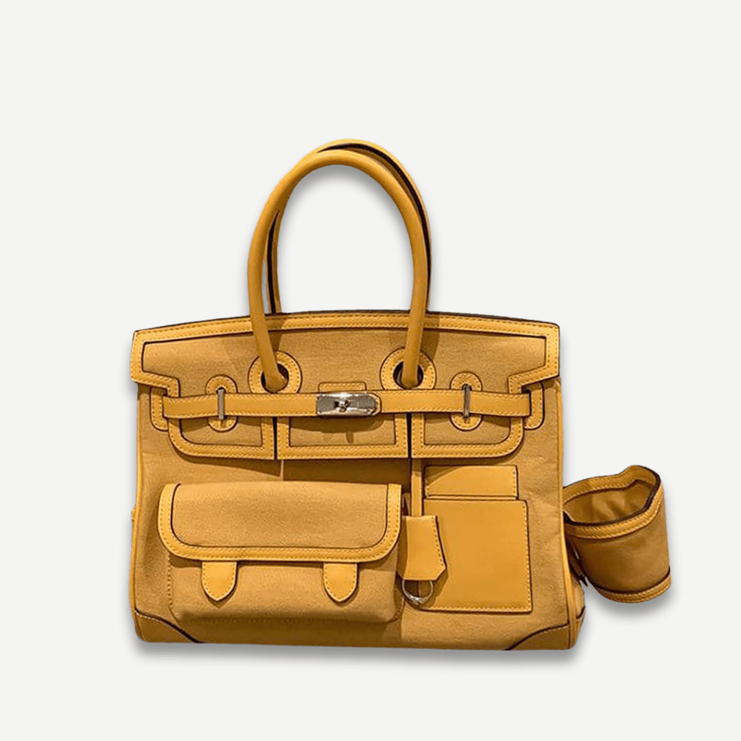 A suede tote crafted with the globe-trotter in mind. Luxurious leather detailing frames the sturdy yet chic silhouette, complete with plenty of external pockets and pouches, including a specially designed drink holder. Carry it along for an unparalleled journey of discovery.